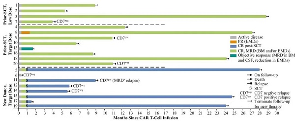 在这项研讨中,20名到场者接管了CD7 CAR T细胞输注。颠末中位随访时候为27.0(规模为24.0-29.3)个月后,整体反映率和完整减缓率别离为95%(19/20名患者)和85%(17/20名患者),此中35%(7/20)的患者停止了干细胞移植。6名患者呈现疾病复发,复发中位时候为6(规模为4.0-10.9)个月,此中4名患者发明肿瘤细胞上的CD7抒发丧失。医治后24个月的无停顿保存率(PFS)和总保存率(OS)别离为36.8%(95% CI,13.8-59.8%)和42.3%(95% CI,18.8-65.8%),中位PFS和OS别离为11.0(95% CI,6.7-12.5)个月和18.3(95% CI,12.5-20.8)个月。医治后30天内报告的不良事务包含3-4级细胞因子开释综合征(CRS; 10%)和1-2级移植物抗宿主病(GVHD; 60%)。